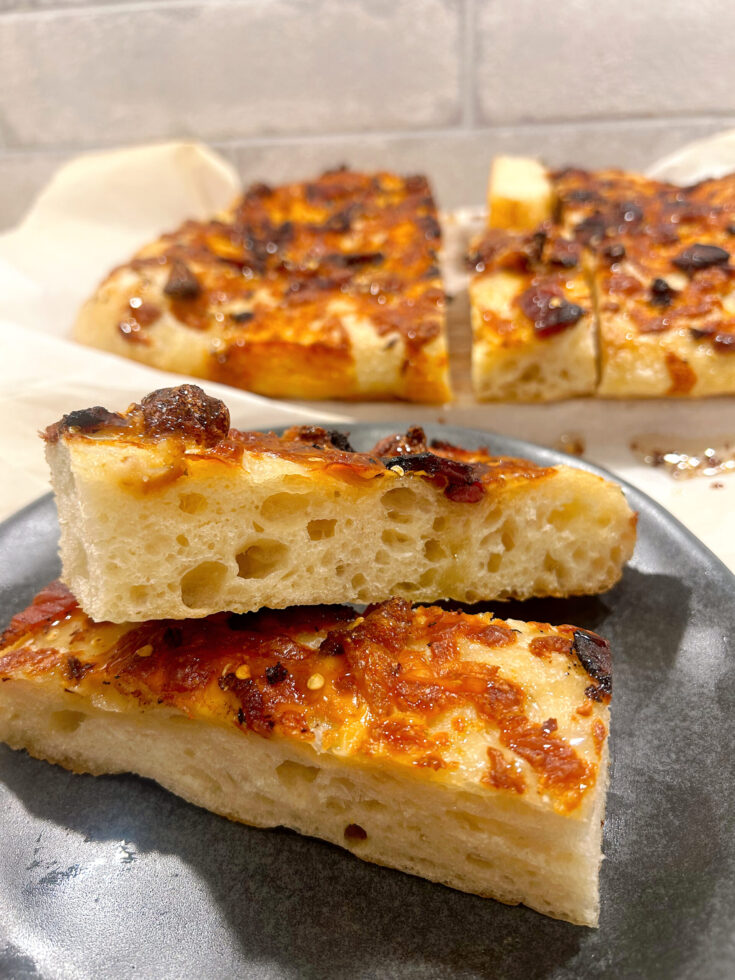 You can use whatever focaccia bread recipe you like and spice it up with this toppings combination, however I love my recipe because its soft and airy like you want but the dough is still easy to work with! I play around with new sourdough flavors all the time and when I tell you Cole said this was the best one yet, I was fully on board with him.